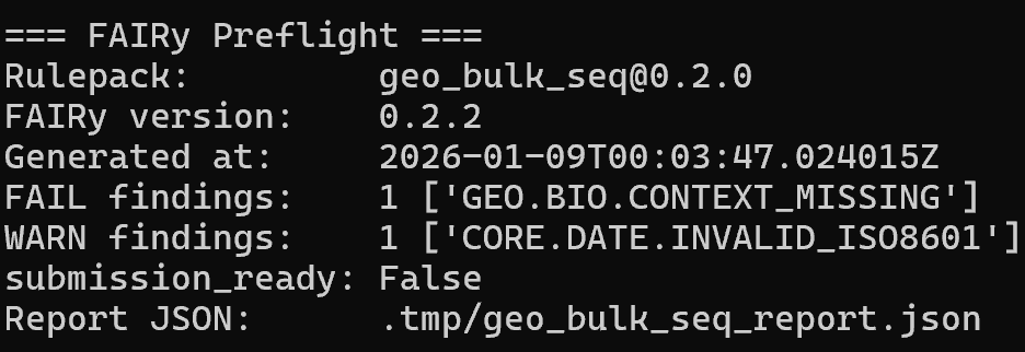 Each report below shows actual validation results from FAIRy rulepacks. These examples demonstrate common issues researchers encounter when preparing datasets for submission. Click any report to view the full details.